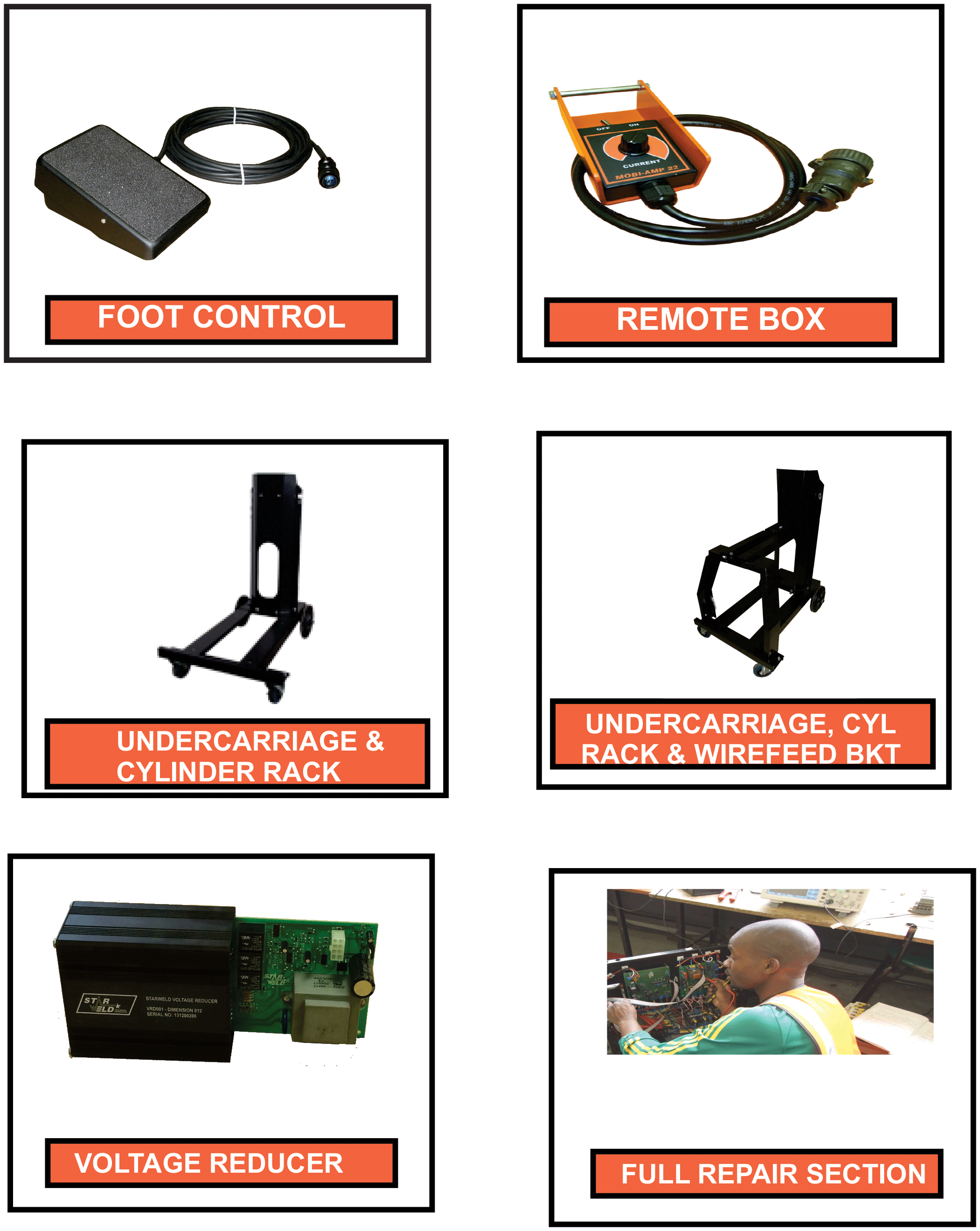 We also have extra options available: Foot Controls Remote Pot Boxes Undercarriage & Cylinder Rack Undercarriage, Cylinder Rack & Wire Feeder Bracket Voltage Reducing Units Argon Flow Meters Various Torch Validations on and off-site Full Repair Section Etc.